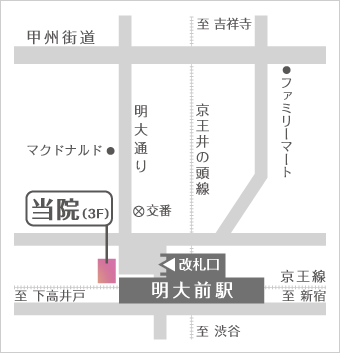 明大前駅の改札口正面のビルにございます。明大前の他、下高井戸、代田橋、桜上水、笹塚、永福町、東松原など、京王線・京王井の頭線の各駅からも通院便利な眼科クリニックです。